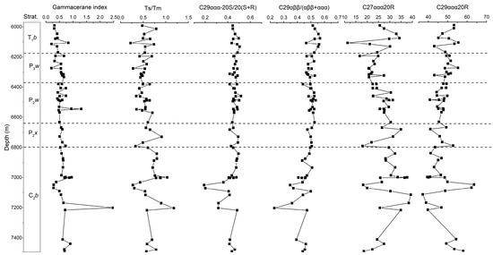 Profile for parameters from hopanoids and steranes of samples from the MS-1 well of the Late Carboniferous–Early Triassic.