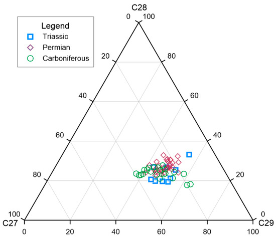Ternary plot showing the distribution of regular steranes (C27–C28–C29) of samples from the MS-1 well of the Late Carboniferous–Early Triassic.