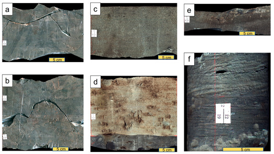 Scanning core photos of samples from the MS-1 well: (a,b), tuff in C2t; (c), siltstone mudstone in P2w; (d), grayish-white siltstone and black mudstone in P3w, with scouring surface between them; (e,f), siltstone mudstone in T1b.