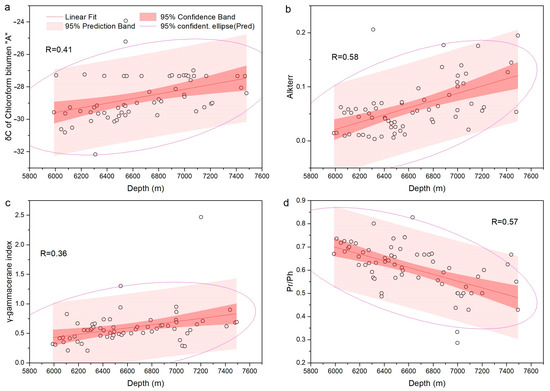 Correlation between depth and δC of chloroform bitumen “A” (a), Alkterr (b), γ-gammacerane index (c), Pr/Ph (d).