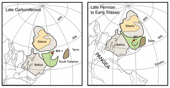 The Late Paleozoic orogenic belt in northern Xinjiang and adjacent areas developed a series of successive, southward accretionary belts along the broad South Siberian active margin, forming the Alaska–Aleutian arc system (Kokchetav–Morth Tianshan), the Japanese arc system (Altai, Chinese Middle Tianshan), and the Mariana arc system (Balkhash, West Junggar, East Junggar) [4,9] (Figure 9). Paleomagnetic reconstructions indicate that complex nappes occurred in the Early Paleozoic. In the Late Devonian, a complex Kokchetav–North Tianshan arc system with a straight extension of the main axis was formed under growth and fusion of the circum-microcontinental type. Approximately corresponding to the late Early Carboniferous, the Junggar paleo sheet formed a rift trough along the Bogda area, separating the Junggar-occupied sheet. The rift trough did not reach the level of the emergence of oceanic crust, so it is also called the Ora Valley. After the middle of the Early Carboniferous, the Siberian plate and the Junggar paleolithic sheet underwent continental collisional orogeny, and the ocean basin disappeared. The ocean between the Junggar paleo sheet and Kazakhstan finally closed at the end of the Carboniferous or the beginning of the Permian, while the ocean south of the basin closed in the Late Carboniferous and entered the intra-land orogenic stage, and the relatively closed residual marine environment in the Late Carboniferous study area coincided with it. In the Permian period, geosyncline closed, and folded mountain series were formed successively, and the paleo-plates were gradually linked to form a joint paleo-continent (Pangaea). With the further expansion of the land area, gymnosperms began to decline on land, true and seed ferns flourished, and the first gymnosperms appeared. From the Permian to the Middle Triassic, the Junggar Basin was in the foreland basin tectonic development stage, and the sediment evolution of the Xiazijie, Urho, and Baikouquan Formations also reflected the gradual disappearance of marine fingerprints and the increasingly obvious characteristics of continental sedimentation; the organic matter of terrestrial origin continued to increase, and the salinity of water bodies became increasingly low. In conclusion, regional tectonic evolution constrained the variability of lake waters in the MS-1 well, while the Carboniferous global warming and wetting event, Permian anoxic event, and Late Permian–Early Triassic drought event influenced the organic matter composition and redox conditions of the lake waters.