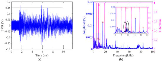 We took the typical EMR waveform with a sampling frequency of 5 MHz obtained in the experiment as an example to introduce the EWT process. Figure 1a presents the EMR waveform, and Figure 1b describes the result of conventional Fourier axis segmentation. In this example, when α = 0.3, two local maxima are obtained. Based on these two local maxima, it is difficult to separate the Fourier axis properly. As shown in Figure 1b, when α = 0.2, seven local maxima marked by red circles in the Fourier spectrum were obtained, and then the Fourier axis was segmented into nine parts. The Fourier spectrum of the EMR waveform was complex, and there were often two or more high maxima close to each other, exemplarily marked by the black oval boxes in Figure 1b. In this way, using the conventional method of the Fourier axis segmentation, these adjacent local maxima will be easily divided to form different filter banks, and then over–decomposition will occur, which is not conducive to the time–frequency analysis of EMR waveform. Therefore, the conventional method is not applicable to the Fourier axis segmentation of the typical EMR waveform to a certain extent.