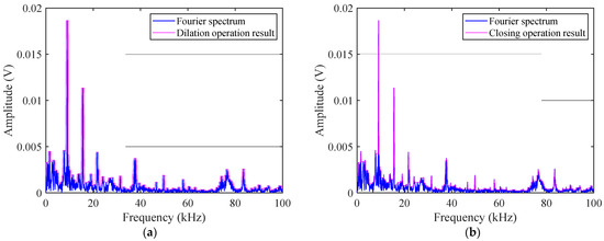 where pN is the sampling point number of the signal waveform; fs is the sampling frequency; and fd is the drawing frequency resolution. Specific parameters of the example EMR waveform are as follows: fs is 5 MHz, the duration of the intercepted EMR waveform is 11.749 ms (i.e., pN is 58745), and fd is 1 kHz. According to Equation (10), the window width B is six, ensuring that the local maxima existing in the frequency band of 1 kHz can be represented by one significant local maximum. The result of the dilation operation (i.e., the first step of the closing operation) is shown in Figure 2a. It can be seen that the adjacent local maxima are covered by the same value marked by the magenta curve, and the maximum width of the same value is 1 kHz, ensuring that any two significant local maxima with an interval bandwidth less than 1 kHz can be divided together into the same part of the Fourier axis. Figure 2b presents the result of the erosion operation after the dilation operation. Multiple maxima next to each other are represented by the same feature local maximum, which lays the foundation for dividing the Fourier axis into tightly supported segments with feature local maxima as the centers.