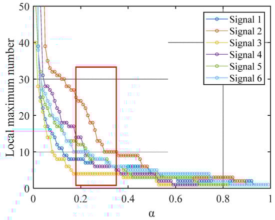 Based on the result of the closing operation with adaptively selected window width for the Fourier spectrum, the local maxima of the closing operation curve can be obtained. The threshold value used to count the number of local maxima participating in the Fourier axis segmentation can be obtained by MM + α(M1 − MM). The different values of α will raise the different thresholds and the different local maximum numbers. Figure 3 presents the variation in the local maximum numbers along with the different thresholds with α of 0.01, 0.02,..., and 0.99. With the increasing α, the number of the local maxima above the thresholds decreases rapidly at the beginning and then decreases slowly in a stepwise manner. Meanwhile, the local maxima number maintains constant on several consecutive points, implying that the EWT results are also constant. According to the variation characteristics of the local maxima number, we took the number of invariant points as five or six, in other words, during each calculation, the threshold value is calculated with α of 0.01, 0.02, …, 0.99, until there are five or six points on that the local maximum number that remain unchanged, and a value of α is obtained. As shown in the local area marked by the red box in Figure 3, the obtained value of α usually appears in 0.18–0.35, and the corresponding local maximum number in 4–10. In addition, if the number of the finally obtained local maxima above the threshold is less than five, while the number of the total local maxima is larger than five, the first five maxima (i.e., M1, …, M5) are forcibly selected to participate in the segmentation of the Fourier axis. The frequency points corresponding to these local maxima together with 0 and π provide a basis for Fourier axis segmentation.