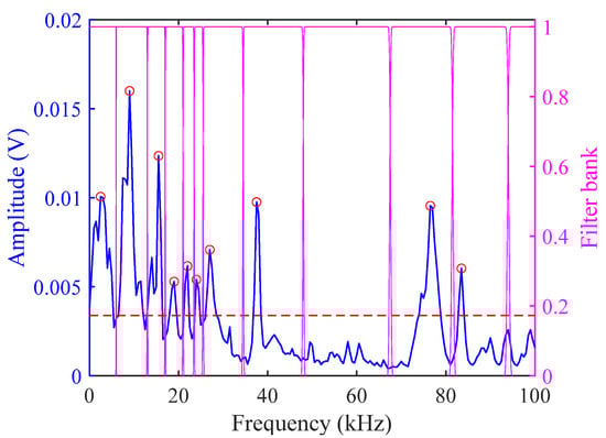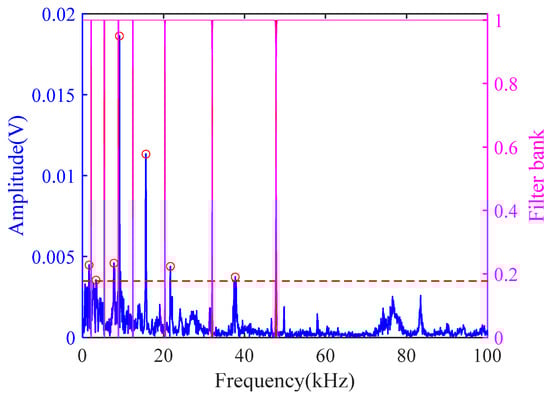 To solve the problem that short–time high amplitude frequency components cannot be well extracted, the segmentation method of the Fourier axis was further improved, and an adaptive segmentation method of the Fourier axis based on STFT and closing operation is proposed. First, the time–frequency spectrum is obtained by STFT, and the frequency resolution of STFT is half of the final drawing frequency resolution of the time–frequency spectrum obtained by EWT–HHT. In this example, the frequency resolution of STFT shall be 0.5 kHz, that is, the Hamming window width and the signal length participating in DFT shall be 2 ms (i.e., 10,000 sampling points). The maximum amplitude corresponding to each frequency point is obtained based on the time–frequency spectrum of STFT, as shown in Figure 8. Compared with the Fourier spectrum obtained by DFT shown in Figure 4, the local maximum amplitudes of components around 2.5 kHz, 19 kHz, 24 kHz, 27 kHz, 77.0 kHz, and 83.5 kHz, as shown in Figure 8, increased significantly. For the Fourier axis obtained by STFT, the closing operation was performed with the window width B = 1, according to the method mentioned in Section 3.2.3, MM, M1, and α were 0.0160 V, 0.8070 mV, and 0.17, respectively, so the threshold was 0.0034 V. The number of the local maxima above the threshold was 10, as shown by the red circles in Figure 8. In the Fourier axis segmentation, sometimes two adjacent local maximum frequencies were far apart. Taking 37.5 kHz and 77.0 kHz, as shown in Figure 8, as an example, if only one split point is set between them according to Section 3.2.3, these components decomposed by EWT will be mixed with other low–amplitude components to some extent, which is not conducive for presenting the evolution characteristics of high–amplitude frequency components. Therefore, to better divide the Fourier axis, if the split point is more than 10 times the drawing frequency resolution (i.e., 10 kHz) from the adjacent frequency of local maximum, a new split point is forcibly added at the position of 10 kHz from the adjacent frequency point. As a result, there are two split lines between 37.5 kHz and 77.0 kHz, and this Fourier axis is divided into 13 segments. The split lines and filter banks below 100 kHz are shown in Figure 8.