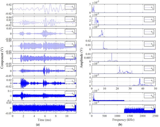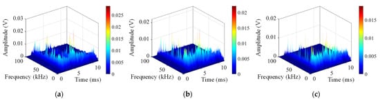 Based on the filter banks shown in Figure 4, the example EMR waveform is decomposed into nine components (i.e., c1, c2, …, c9), as shown in Figure 5a. These components fluctuate uniformly on the time domain, and the fluctuation amplitude suddenly increases when the effective signal appears, indicating that the frequency they contain is relatively single. Figure 5b presents the Fourier spectra of these nine components. The Fourier spectrum of each component was exactly the segmented Fourier spectrum shown in Figure 4, and there was no modal aliasing phenomenon among these nine components in the frequency domain. However, it is noteworthy that the c8 component still contained a strong effective signal component that has not been extracted. The Hilbert spectrum of the example EMR waveform was obtained via HT, as shown in Figure 6. Except for the c8 component, each component rarely appeared in mode aliasing, and the high amplitude frequency band was relatively concentrated, which can clearly describe the time–frequency evolution characteristics below 42 kHz.