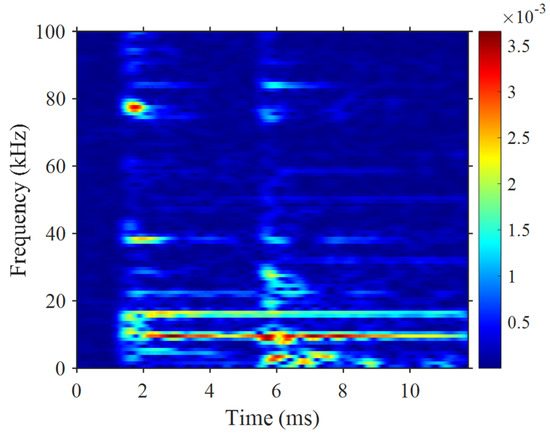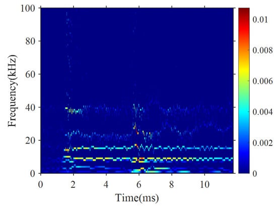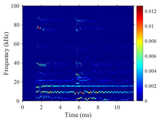 Figure 7 presents the time–frequency spectrum of the example EMR waveform obtained by STFT. The STFT adopts Hamming window with a window width of 1 ms (i.e., 5000 sampling points), the window sliding step size is 1 μs (i.e., five sampling points), and the signal length participating in DFT of STFT is 1 ms, so the frequency resolution of the spectrum is 1 kHz. Comparing Figure 6 and Figure 7, it can be seen that the components around 77.0 kHz and 83.5 kHz were not effectively decomposed by EWT. This is because the 77.0 kHz and 83.5 kHz frequency points were not effectively segmented in the Fourier axis, but were together segmented into c8, as shown in Figure 4. The deeper reason is that the object of DFT is the whole waveform, so the Fourier spectrum has no time dimension. However, the actual EMR waveform often has some frequency components, with high amplitudes appearing for a short time. Although the amplitudes are relatively large, the amplitudes of the frequency points are still relatively small in the Fourier spectrum, making it difficult to separate the short–time high amplitude frequency components based on the Fourier spectrum obtained by DFT.