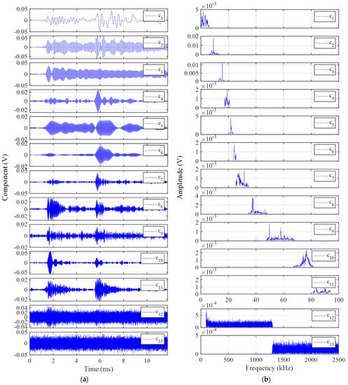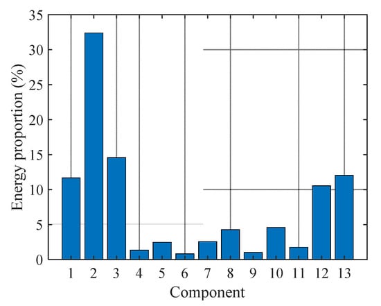 Figure 9a shows the 13 components of the EMR waveform decomposed by EWT based on STFT and closing operation, and Figure 9b shows the Fourier spectrum of each decomposed component. The Fourier spectra do not overlap others, and the combination of these Fourier spectra is exactly the Fourier spectrum of the entire EMR waveform. Compared with Figure 5b, the component of 34–94 kHz was reasonably divided into c8–c11, therefore the components around 77.0 kHz and 83.5 kHz with short–time high amplitude fluctuation characteristics are well divided into different components. In addition, the intensities of c12, shown in Figure 9a, and c8, shown in Figure 5a, were 0.0513 V and 0.1101 V, respectively, and the maximum amplitudes of the Fourier spectra of these two components were 7.64 × 10−4 V and 2.53 × 10−3 V, respectively, indicating that the effective component of the EMR waveform was properly decomposed. Figure 10 presents the energy proportions of the 13 components. The frequency bands of c12 and c13 on the Fourier axis were 94–1.3 MHz and 1.3–2.5 MHz, respectively, and their widths were relatively larger. Therefore, even though the amplitudes of c12 and c13 were small, the total energies were still relatively large, accounting for 10.5% and 12.0%, respectively. Except for c12 and c13, the energy proportions of c1, c2, and c3 with the frequency bands of 0–6 kHz, 6–13 kHz, and 13–17 kHz were 11.7%, 32.4%, and 14.6%, respectively, which were significantly larger than that of other components. As shown in Figure 9a, c1, c2, and c3 not only had large amplitudes but also long durations, and almost throughout the entire effective waveform, which is consistent with the presented evolution characteristics of the time–frequency spectrum shown in Figure 11. The components around 77.0 kHz and 83.5 kHz were decomposed effectively into c10 and c11 with the frequency bands of 67.5–81.5 kHz and 81.5–94.0 kHz, respectively. As shown in Figure 9a, c10 and c11 contained the typical short–time high amplitude fluctuation, and their energy proportions were 4.6% and 1.7%, respectively. Compared to Figure 6, Figure 11 well describes the short–time high amplitude fluctuation characteristics of the components around 77.0 kHz and 83.5 kHz. Comparing Figure 7 and Figure 11, the time–frequency spectrum obtained by EWT–HT was more refined than that obtained by STFT in both the frequency and time resolutions.