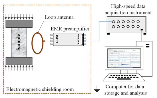 The schematic diagram of the experimental system is shown in Figure 12. The YAW–600 pressure tester was adopted for loading, and its maximum load is 600 kN, the load resolution is 3 N, and the displacement resolution is 0.3 μm. The data acquisition system is composed of a high–speed data acquisition instrument and a high–performance computer. The data acquisition instrument has 12 channels, an A/D accuracy of 16 bits, and a maximum sampling frequency of 10 MHz. A SAS–560 loop antenna with a response frequency range of 20 Hz–2 MHz was used to sense the EMR signal. The EMR preamplifier matched with the SAS–560 loop antenna had four channels (i.e., two channels for 0–10 MHz and two channels for 10 kHz–10 MHz), and its amplification multiple ranged from 50 dB to 80 dB. The experiments were conducted in a GP1A electromagnetic shielding room with shielding effectiveness of 14 kHz ≥ 75 dB, 100 kHz ≥ 95 dB, 200 kHz ≥ 100 dB, and 50–103 MHz ≥ 110 dB.