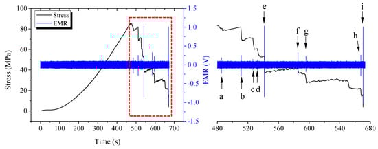 Figure 13 shows the stress curve and EMR signal of the rock sample during the entire loading process. The example rock sample had a peak stress of 85.52 MPa and an elastic modulus of 14.28 GPa. Before the peak stress, the stress almost increased monotonically, and there was no significant stress drop and EMR signal at this stage. From the enlarged view on the right side of Figure 13, it can be seen that the rock sample was rapidly destabilized and destroyed after the peak stress, resulting in a large number of significant stress drops and EMR signals. The experimental results in the literature [,,,,] indicate that whether before or after the peak stress, the EMR signals are generally accompanied by stress drops. Not only EMR but the electrical signal pressure–stimulated current (PSC) also had a significant response when approaching the fracture load levels [,,]. Since the example rock sample was fine sandstone and relatively hard and brittle, the significant fractures or stress drops were mainly concentrated at the stage after the peak stress. The significant EMR signals were numbered a, b, …, and i. In the failure stage of the rock sample, some significant fractures were accompanied by multiple EMR signals. For example, the waveform numbered i shown in Figure 13 contained two consecutive signals marked as i1 and i2, shown in Figure 14.