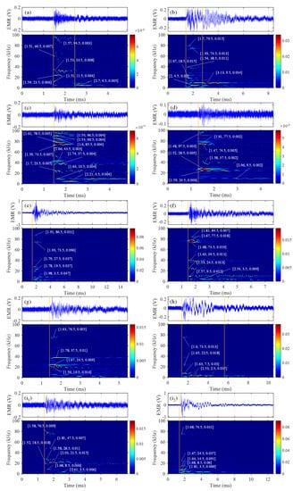 The EMR signals numbered a, b, …, and i in Figure 13 were decomposed by the improved EWT, and then their Hilbert spectra were obtained by HT. Figure 14 presents the waveforms and Hilbert spectra of these EMR signals. Since the frequency bands of these EMR signals are mainly below 100 kHz, this paper intercepted the time–frequency spectra below 100 kHz for analysis. Moreover, some significant feature points of the time–frequency spectra were marked as “[time, frequency, amplitude]” in Figure 14 to aid in the analysis. Table 1 lists the parameters of the EMR waveforms and their time–frequency spectra.