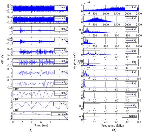 EMD results: (a) decomposed components of EMR waveform; (b) Fourier spectra of decomposed components.