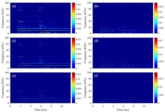 Comparison of the time–frequency spectra with different drawing frequency resolutions obtained by EWT–HT and HHT: (a) obtained by EWT–HT, 1 kHz; (b) obtained by HHT, 1 kHz; (c) obtained by EWT–HT, 0.5 kHz; (d) obtained by HHT, 0.5 kHz; (e) obtained by EWT–HT, 0.25 kHz; (f) obtained by HHT, 0.25 kHz.