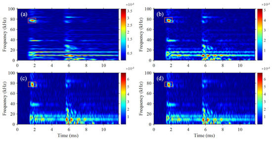 According to the STFT theory, the resolutions of STFT in the time domain and frequency domain cannot be taken care of both, that is, to improve its time resolution, the width of the STFT window must be reduced. Accordingly, to increase the frequency resolution, it is necessary to increase the width of the STFT window, or to increase the time length of the signal participating in the DFT of STFT by supplementing zero. Figure 18 presents the time–frequency spectra obtained by STFT with different window widths and the time lengths of the signal participating in DFT. The STFT parameters to obtain the time–frequency spectra shown in Figure 18a–c were as follows, respectively: the Hamming window widths were 1 ms, 0.5 ms, and 0.25 ms, the number of points participating in DFT was 5000, and the window sliding step size was five sampling points. For the 0.5 ms and 0.25 ms window widths, the signal after windowing was supplemented with zero to ensure the number of points participating in DFT was 5000. The STFT parameters of Figure 18d were as follows: the Hamming window width was 0.25 ms, and the number of points participating in DFT was 20,000 via adding zero. Comparing the magenta box areas shown in Figure 18a–c with the reduction in the Hamming window width, the red area in the box was shortened laterally and elongated longitudinally, indicating that its time resolution increased while the frequency resolution decreased. Compared to Figure 18c, although the frequency resolution of the time–frequency spectrum shown in Figure 18d was improved by adding zero, it only made the time–frequency spectrum smoother, and the red area in the magenta box did not change, indicating that the actual frequency resolution had not been improved. Although the time–frequency spectrum shown in Figure 18a has an actual frequency resolution of 1 kHz equaling the drawing frequency resolution of Figure 16a, there were other frequency components with relatively higher amplitude around its main frequency components, as shown in Figure 18a, making the main frequency components more blurred, while the main frequency components were clearer and more obvious in Figure 16a. Although the time–frequency spectrum shown in Figure 18d had a drawing time frequency of five sampling points, there was still a certain gap compared with the actual time resolution of five sampling points of Figure 16e because its Hamming window width was 0.25 ms. It is noteworthy that although the STFT result was not as good as that of EWT–HT in the time domain and frequency domain resolutions, the time–frequency spectrum distribution characteristics of these two results were generally consistent.
