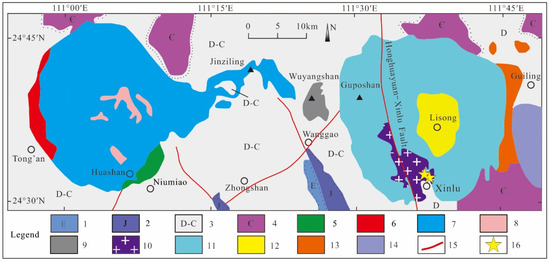 Schematic geological map showing the Xinlu pluton and its surrounding areas in northeastern Guangxi. 1—Palaeogene; 2—Jurassic; 3—Devonian–Carboniferous; 4—Cambrian; 5—Niumiao pluton; 6—Tongan pluton; 7—Huashan pluton; 8—Yinping pluton; 9—Wuyangshan pluton; 10—Xinlu pluton; 11—Guposhan pluton; 12—Lisong pluton; 13—Guiling pluton; 14—Daning pluton; 15—fault; 16—sampling location.
