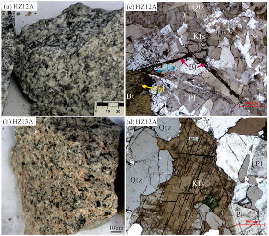The Xinlu pluton studied in this paper is located in the southeastern part of the Huashan–Guposhan pluton (Figure 2) and is about 48 km2 in area. Samples HZ12A and HZ13A were collected from Xinlu pluton. The sample HZ12A is a fine-grained biotite granite (Figure 3a) and is mainly composed of quartz (around 45%), plagioclase (around 35%), K-feldspar (around 10%), and biotite (around 10%). The accessory minerals are mainly sphene, zircon, apatite, chlorite, epidote, magnetite, and ilmenite. The quartz shows melting corrosion structure (Figure 3c). The sample HZ13A is coarse-grained porphyritic potassium granite (Figure 3b) and mainly consists of quartz (around 45%), K-feldspar (around 25%), plagioclase (around 20%), and biotite (around 10%). The accessory minerals include zircon, apatite, magnetite, and ilmenite. The plagioclase and k-feldspar always contains inclusions of quartz. The K-feldspar is brown, due to alteration, and shows two directions of cleavage (Figure 3d). The quartz shows rounded margins (Figure 3d). The biotite always alters to chlorite and epidote (Figure 3c).