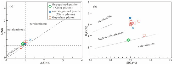 Plots of (a) A/NK versus A/CNK and (b) K2O versus SiO2 for the granites from the Xinlu and Guposhan plutons. A/NK = Al/(Na + K), A/CNK = Al/(Ca + Na + K) (molar ratio). Detailed data information is shown in Table 1.
