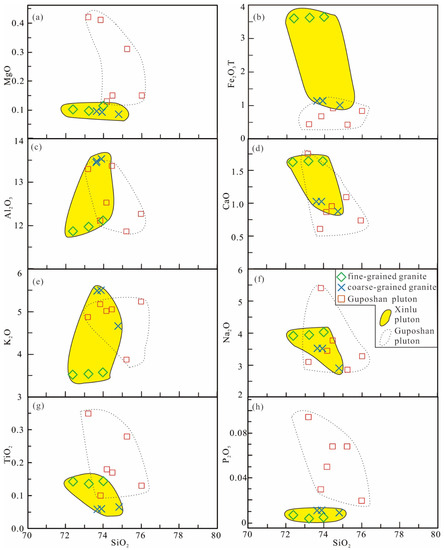Plots of SiO2 versus (a) MgO, (b) Fe2O3T, (c) Al2O3, (d) CaO, (e) K2O, (f) Na2O, (g) TiO2, and (h) P2O5 for the granites from the Xinlu and Guposhan plutons.
