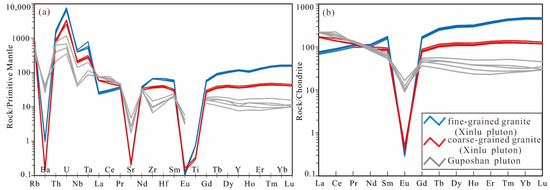 (a) Primitive-mantle-normalized trace element spidergrams and (b) chondrite-normalized REE patterns for the granites from the Xinlu and Guposhan plutons.