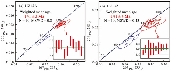 LA–ICP–MS U–Pb dating results are listed in Table 3. Fifteen zircon grains were analyzed for sample HZ12A. Four analyses deviated from concordia, indicating a late Pb loss due to subsequent tectonothermal event(s). Ten spots yielded a coherent group with the 206Pb/238U weighted mean age of 141 ± 3 Ma (MSWD = 0.8) (Figure 7a), interpreted as the crystallization age of the sample. One older spot analysis was calculated as 244 Ma, likely representing the age of inherited or captured zircons. Nineteen grains were analyzed for sample HZ13A. Six spots deviated from concordia, suggestive of a Pb loss due to subsequent tectonothermal event(s). Ten analyses yielded a coherent group with the 206Pb/238U weighted mean age of 141 ± 4 Ma (MSWD = 0.43) (Figure 7b), interpreted as the crystallization age of the sample. Three older spots were calculated as 732 Ma, 502 Ma, and 244 Ma, respectively, likely representing the ages of inherited or captured zircons.
