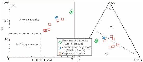 Plots of (a) 10,000 × Ga/Al versus Nb and (b) Nb-Y-3 × Ga for the granites from the Xinlu and Guposhan plutons.