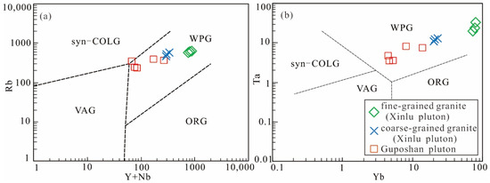 Plots of (a) Rb versus Y + Nb and (b) Ta versus Yb for the granites from the Xinlu and Guposhan plutons. Abbreviations: WPG, within plate granite; syn-COLG, syn-collision granite; VAG, volcanic arc granite; ORG, ocean ridge granite.
