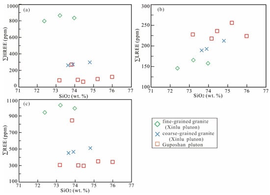 Plots of SiO2 versus (a) ΣHREE, (b) ΣLREE, and (c) ΣREE for the granites from the Xinlu and Guposhan plutons.