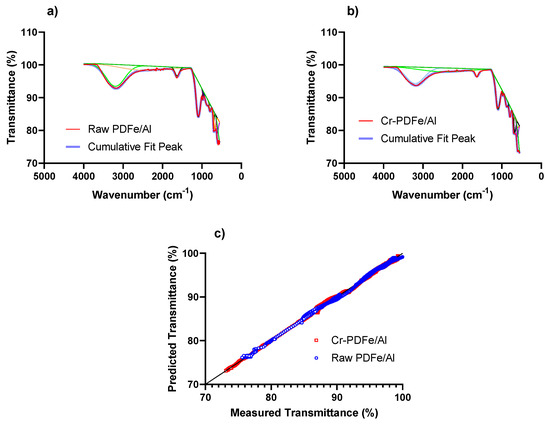 Figure 1. The deconvoluted peaks of the FTIR spectra for PDFe/Al (a) before and (b) after Cr(VI) adsorption. (c) shows the Transmittance for Raw PDFe/Al and Cr-PDFe/Al.