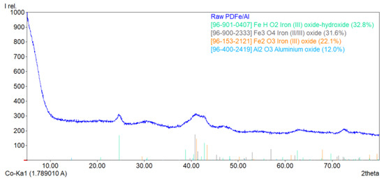 Figure 2. XRD diffractogram of the PDFe/Al before Cr(VI) adsorption. Error between selected phases and experimental profile = 3.3%.