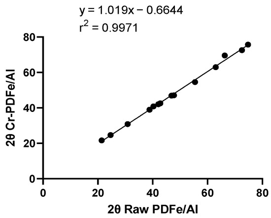 As indicated in Figure 4, the plot for 2θ values for PDFe/Al before and after Cr(VI) adsorption shows a clear shift in 2θ values of 0.66° thus confirming internal adsorption induced strains as previously reported in Muedi et al. 2022 [2].