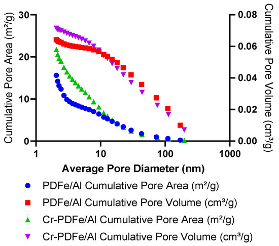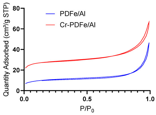 Figure 6 depicts the nitrogen adsorption–desorption isotherms of the produced PDFe/Al before and after Cr(VI) adsorption. The adsorbed quantities increased as relative pressure increased, which could indicate that the adsorbent’s non-rigid nature and the placement of the distinctive shoulder are compatible with condensate destabilization at the P/P0 ratio, which is limiting the entire process. Furthermore, type IV adsorption isotherm behaviour was observed for both the raw PDFe/Al and the Cr-adsorbed PDFe/Al.