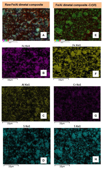 Figure 8 shows the mapping of the elemental composition of the PDFe/Al before and after Cr(VI) adsorption using energy dispersive X-ray (EDX). The raw PDFe/Al confirms the co-precipitation of Fe and Al from AMD, (Figure 8A–D). Figure 8E–H illustrates the elemental composition of the material after Cr(VI) adsorption, where chromium is observed to be present.