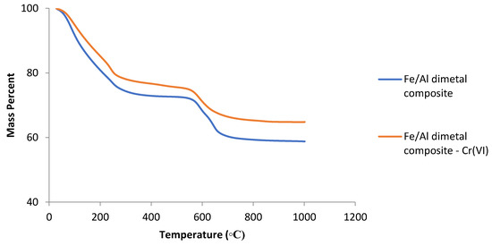 The thermal stability of PDFe/Al before and after Cr(VI) adsorption is demonstrated in Figure 9. The calcination process was broken down into three stages, with the first involving the loss of moisture from the material at temperatures ranging from 100 to 350 °C. At temperatures between 400 and 550 °C, the second step involves the loss of chemically bonded HOH, while the third stage involves the loss of the hydroxyl group (-OH) at temperatures over 550 °C.