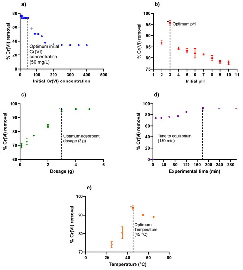 Figure 10. Effects of different operational parameters on the adsorption of Cr(VI), where (a) shows % Cr(VI) removal versus initial Cr(IV) concentration; (b) shows % Cr(VI) versus initial pH; (c) shows % Cr(VI) removal versus dosage; (d) shows % Cr(VI) removal versus agitation time; and (e) shows % Cr(VI) removal versus temperature.