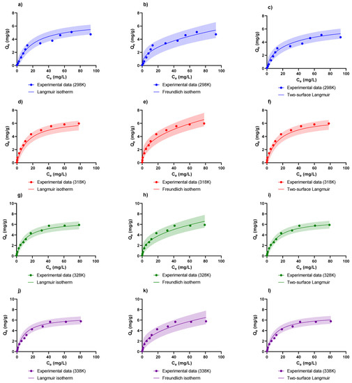 The two-surface Langmuir adsorption isotherm is depicted in Figure 12c, which posits that the adsorbent’s surface contains various surface types with varying adsorption capabilities. The results show that Qmax,1 = 1.80 mg·g−1 for one surface and Qmax,2 = 5.096 mg·g−1 for the other, for a total maximum adsorption of Q = 6.896 mg·g−1.