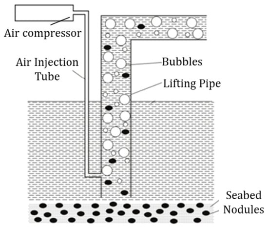 After the failure of simple mechanical deep-sea mineral lifting systems, deep-sea mineral pipe lifting systems were inspired by the horizontal long-distance pipeline transport of mineral particles in land-based mining projects. In the late 1970s, a deep-sea mineral pipeline lifting system was proposed by Ocean Management Inc. (OMI), a consortium of countries including the U.S., Japan, Canada, and Germany [,]. The system generally consisted of three parts: a subsea mining vehicle that collected nodules on the sea floor, a lifting system for transporting minerals from the seabed to the surface by hydraulic or pneumatic means through pumps and pipes, and a surface support system that provided power and operational support for subsea mining vehicles, lifting systems, performed preliminary dewatering and sorting systems. Figure 1a,b are schematic diagrams of pneumatic pipe lifting and hydraulic pipe lifting in a deep-sea mining system, respectively.