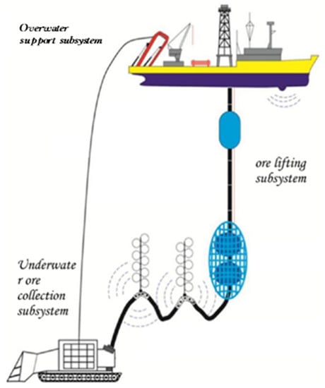Based on the latest commercial mining system schemes for deep-sea polymetallic nodules proposed by various countries, the hydraulic lifting system is determined as the most promising deep-sea mining technology [,,,]. The hydraulic mining system is mainly composed of three parts: an overwater support subsystem and lifting subsystem []. Figure 4 shows the overall layout of the mining system.
