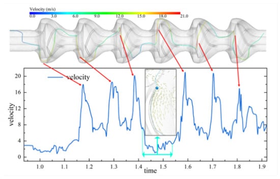The solid–liquid two-phase flow simulation based on the Euler–Lagrange model currently mainly includes two simulation methods, CFD–DPM and CFD–DEM, both of which use the Lagrange particle tracking method to simulate nodule particles. The difference is that DPM ignores the particle volume, while DEM considers the impact factors such as particle volume collision and volume fraction through the soft sphere model, which improves the accuracy and reliability of large particle motion and particle dynamics simulations, especially suitable for simulating particle dynamics research of low concentration (volume concentration less than 10%) and coarse particle slurry transportation. In the CFD–DEM coupling simulation of the lifting pump, the particles with a particle size below 3 mm are usually ignored or regarded as a homogeneous slurry mixed with seawater to improve the calculation speed. It was found by Wang [] et al. that the particle size mainly affects the vortex strength in the pump, and has a limited impact on the hydraulic performance after the calculation and analysis of the solid–liquid two-phase unsteady flow of a single-stage deep-sea mining lifting pump based on CFD–DEM. Ning [] analyzed and compared the CFD–DEM calculation results with the particle velocity test results (Particle Image Velocimetry (PIV)), and when the grid was dense enough, the simulation results were very close to the experiments, which fully verified that CFD–DEM was effective in simulating particles Accuracy and reliability of kinetics. Deng [] artificial particle distribution, particle dynamics, and slurry hydraulic performance through CFD–DEM, and compared the experiment, and found that the error of CFD–DEM coupling simulation of slurry hydraulic performance can be controlled within 2%. Huang [] artificial the volute centrifugal pump under different flow rates based on the EDEM-Fluent coupling platform. When using the Archard wear model, the wear of volute was the largest, accounting for 70% of the total wear. Hu [] analyzed the particles with different particle sizes in the multistage centrifugal pump by CFD–DEM. The introduction of particle bonding made the simulation more realistic, and the results were highly consistent with the experiment. The result of lifting pump CFD–DEM particle dynamics simulation is shown in Figure 6.
