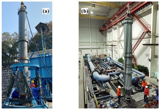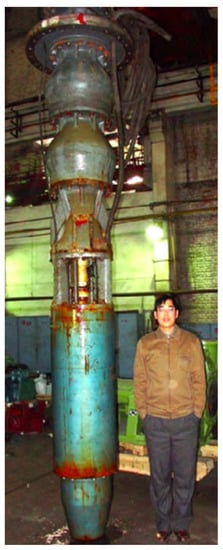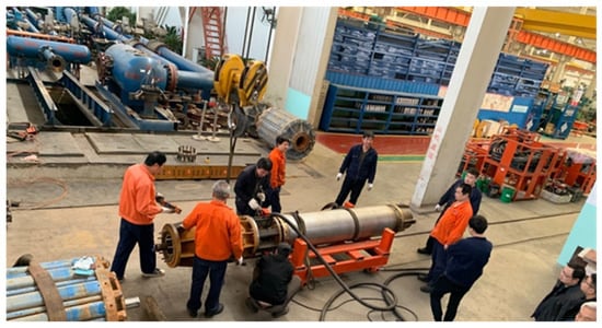 From 2001 to 2005, the China Changsha Research Institute of mining and metallurgy successfully developed a two-stage lifting pump [], as shown in Figure 8, with the support of the “Tenth Five-Year Plan” national marine special research program. The pump is 4.6 m long, the maximum outer diameter is 0.93 m, the specific speed is 198, the lift of each stage is 45 m when the flow is 400 m3/h, and the internal efficiency of the clean water pump reaches 60%. The 30 m high lifting comprehensive test system developed in the “Eighth Five-Year Plan of China” has carried out the slurry conveying test, and the maximum lifting particle reaches 50 mm, but the pump still has the problem of blockage. However, it is determined that the future slurry lifting pump in China will take the high specific speed mixed flow pump as the basic development direction.