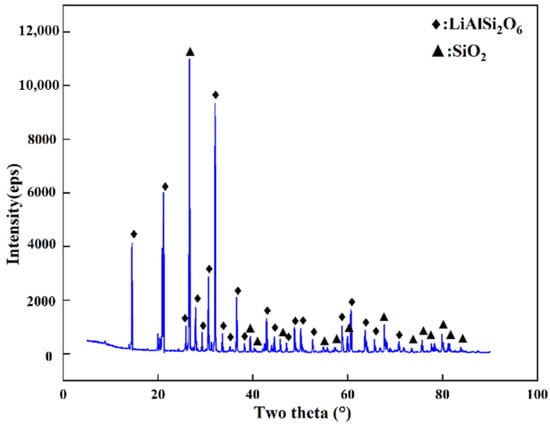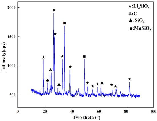 Due to the limited feed amount and the low lithium content in spodumene ore, it was difficult to collect the lithium condensate in a single step, so the lithium-rich condensate was collected through multiple experiments. The phase analysis of the condensate was carried out by XRD; the results are shown in Figure 4. Li mainly existed in the condensate in the form of Li2SiO3. By referring to the literature [27], we found that Li2O and SiO2 formed eutectic compounds in the range of 1028–1201 °C. Therefore, it is believed that the Li2SiO3 generated in the condensation zone was formed by Li in the condensation zone and O2 in air to generate Li2O, which then reacted with SiO2 to form eutectic compounds. The reaction equation is shown in Reaction 4. The Li content in the condensate was 19.47%, as detected by atomic absorption spectrophotometry, and the Li2O content was 41.72%, which was 10.85 times more enriched compared with spodumene.