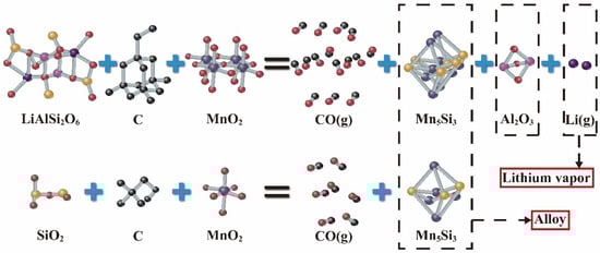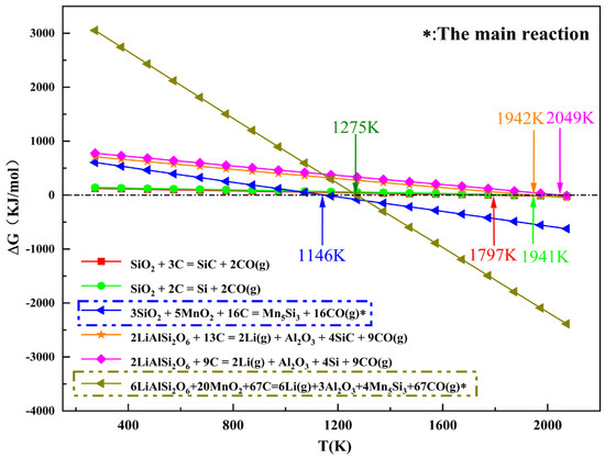 - Thermodynamic calculations were carried out using HSC6.0 thermodynamic software. We found that SiO2 in the ore preferentially participated in the reaction compared with LiAlSi2O6. Compared with the reaction of SiO2 + C and LiAlSi2O6 + C, the decrease was 651 K and 667 K, respectively, indicating that the addition of MnO2 reduced the reaction temperature and increased the feasibility of the reaction.