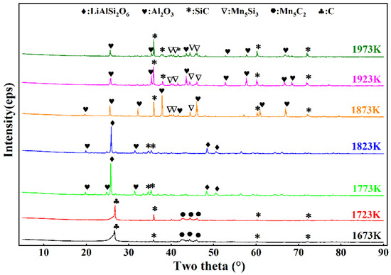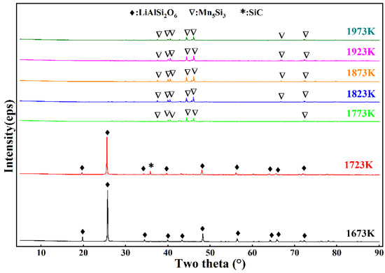 Based on the theoretical calculations and experimental exploration, the reduction time was set to 6 h to ensure the completion of the reaction. After the reaction, due to differences in density, the graphite crucible underwent delamination. Figure 5 and Figure 6 show the XRD patterns of the lower- and upper-layer materials from 1673 K to 1973 K with a holding time of 6 h. Figure 5 shows that LiAlSi2O6 did not begin to react at 1673 K or 1723 K, indicating that the reaction temperature was too low. The Mn5Si2 diffraction peak appeared because SiO2 in the ore preferentially reacted with C and MnO2, which was consistent with the thermodynamic calculations showing that SiO2 should preferentially produce LiAlSi2O6. However, as shown in Figure 6, SiC and Mn2C5 were present in the upper-layer material, and SiC and Mn2C5 were intermediates during the formation of Mn5Si3. This indicates that the reaction between SiO2 and MnO2 was incomplete. When the temperature reached 1773 K and 1823 K, the diffraction peaks shown in Figure 6 all changed to those of Mn5Si3, indicating that the lower-layer material was composed of alloys at these temperatures. The diffraction peaks of Al2O3 and LiAlSi2O6 shown in Figure 6 indicate that LiAlSi2O6 began to react but did so incompletely. When the temperature was 1873 K, the diffraction peak of LiAlSi2O6 shown in Figure 6 disappeared, and the intensity of the diffraction peaks of Al2O3 and SiC was enhanced. At this time, LiAlSi2O6 completely reacted, but the diffraction peak of Mn5Si3 remained, indicating that a small amount of Mn5Si3 was mixed into the upper-layer material. As the reaction temperature continued to increase, the Mn5Si3 diffraction peak remained. When the temperature was 1923 K, the intensity of the SiC diffraction peak shown in Figure 6 was enhanced, indicating that the SiC content increased. The high content of SiC affected the viscosity of the upper-layer material, which inhibited the upward diffusion of lithium vapor, resulting in a decrease in the volatilization rate of lithium. Therefore, the formation of SiC should be controlled during the reaction.
