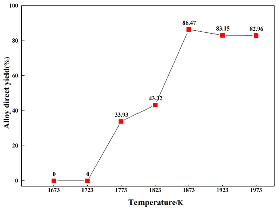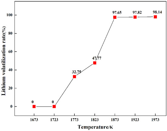 The direct yield of Mn5Si3 was obtained by weighing the alloy in the lower-layer material, as shown in Figure 7. The direct yield of Mn5Si3 was low at temperatures below 1873 K because the spodumene ore had not completely reacted to form an alloy. When the temperature was 1873 K, the direct yield of Mn5Si3 was 86.47%, which was the maximum yield. Continuing to increase the reaction temperature resulted in a slight decrease in the direct yield of Mn5Si3. The reason for the low direct yield of Mn5Si3 was that the formation of SiC caused the loss of Si, and a small amount of Mn5Si3 entered the upper layer. After grinding and mixing the reduced residues in a graphite crucible at varying reduction temperatures, the Li content was detected by atomic absorption spectrophotometry. The influence of varying reduction temperatures on the volatilization rate of Li during the experimental process was investigated; the results are shown in Figure 8. At temperatures below 1723 K, spodumene ore did not participate in the reaction, so the volatilization rate of lithium was 0%. When the reduction temperature was 1773 K, the volatilization rate of Li was 32.75%, indicating that LiAlSi2O6 had begun to be reduced at this temperature, although the reduction degree was low. Upon increasing the temperature, the volatilization rate of Li gradually increased. When the temperature was 1873 K, the volatilization rate of Li was 97.65%. Upon continuing to increase the temperature, the Li volatilization rate remained identical to that at 1873 K, indicating that spodumene completely reacted at 1873 K. This was consistent with the analysis of the results presented in Figure 5 and Figure 6.