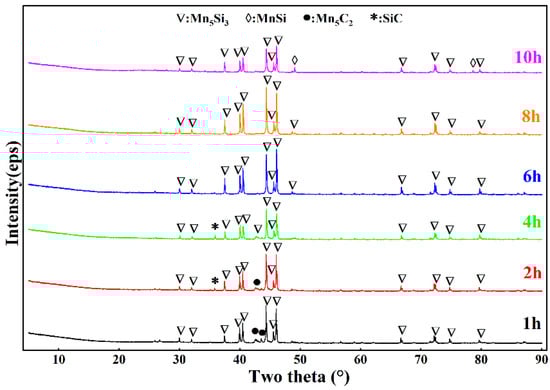 In the previous section, the optimal reduction temperature was determined to be 1873 K by exploring the influence of temperature. In this section, we designed a gradient pair experiment with a reduction time of 1–10 h at the optimal reduction temperature. The material ratio and detection and treatment method used in the experiment were the same as those described in the previous section. Figure 9 shows that before 4 h, in addition to the Mn5Si3 diffraction peaks, there were Mn5C2 and SiC diffraction peaks in the lower-layer material. These peaks indicate that the reaction was incomplete. Upon increasing the reduction time to 6 h, the diffraction peaks of the lower-layer material were due to Mn5Si3 and Mn5C2. The SiC diffraction peaks disappeared, which showed that 6 h was enough to completely separate the upper and lower layers. Figure 10 shows that when the reduction time was 4 h, the diffraction peak of LiAlSi2O6 disappeared. Thus, LiAlSi2O6 was completely reduced, but MnO2 was not completely reduced, indicating that MnO2 required a longer reduction time than LiAlSi2O6.