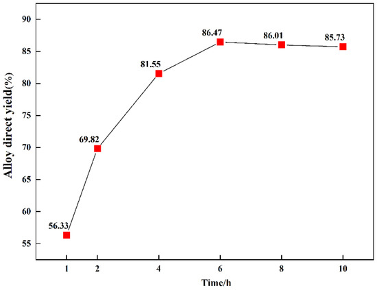 The direct yield of Mn5Si3 with varying reduction times is shown in Figure 11. The direct yield of Mn5Si3 increased significantly when the reduction time was increased 2 h to 4 h, from 56.33% to 81.55%, indicating that LiAlSi2O6 was involved in the reaction from 2 h to 4 h. When the reduction time was 6 h, the direct yield of the alloy was the highest. When the reduction time was increased to 8 h, the direct yield of Mn5Si3 decreased slightly, but the change was insignificant.