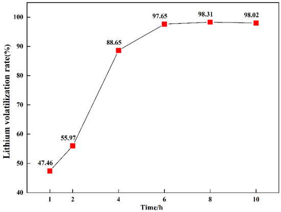 The volatilization rate of lithium with varying reduction times is shown in Figure 12. There was a large increase in 2–4 h, which further verified the conclusion that LiAlSi2O6 was considerably reduced with reaction times of 2–4 h. Upon extending the time, the volatilization rate of lithium increased gradually. When the reduction time was 6 h, the volatilization rate of lithium reached 97.65%, and the reduction of lithium was complete.