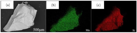 SEM-EDS image of the upper layer at 1873 K and 6 h: (a) SEM image; (b) Mn element distribution; (c) Si element distribution.