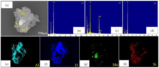 SEM-EDS image of the upper layer at 1873 K and 6 h: (a) SEM image; (b) #1 point scan; (c) #2 point scan; (d) #3 point scan; (e) Al element distribution; (f) O element distribution; (g) Mn element distribution; (h) Si element distribution.