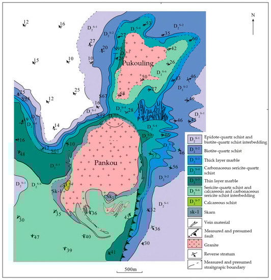 Geological sketch map of the Xuebaoding W-Sn-Be deposit. Modified from [23,24]. Reproduced with permission from Zhou K.C.; Qi L.J.; Xiang C.J.; Feng Q.M.; Wan J.S.; Journal of Mineralogy and Petrology; published by Chengdu University of Technology, 2002 and Zhu X.X.; Liu Y.; Rock and Mineral Analysis; published by Science Press, 2021.