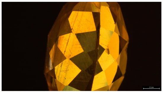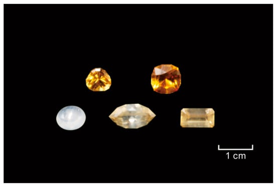 The samples to be tested were collected by the authors in the Xuebaoding mining area, and all samples were processed—4 facets and 1 cabochon (Figure 2). The sample numbers are BWK1–5, in order. The five samples were divided into three groups according to color: (I) colorless scheelite sample—BWK1; (II) pale-yellow scheelite samples—BWK2-3; (III) orange scheelite samples—BWK4-5. The sample BWK2 features parallel color bands (Figure 3), which plays an important role in studying the color origin of Xuebaoding scheelite.